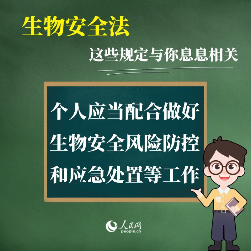 编者按:2021年4月15日,《中华人民共和国生物安全法》开始施行,这是生物安全领域的一部基础性、综合性、系统性、统领性法律,标志着我国生物安全进入依法治理的新阶段。到底什么是“生物安全”?生物安全法中哪些内容与你我有关?人民网带您寻找答案。 什么是“生物安全”? 指国家有效防范和应对危险生物因子及相关因素威胁,生物技术能够稳定健康发展,人民生命健康和生态系统相对处于没有危险和不受威胁的状态,生物领域具备维护国家安全和持续发展的能力。 我国生物安全领域面临哪些主要风险? 生物安全法系统梳理了当前我国生物安全领域存在的8方面主要风险: 1、重大新发突发传染病、动植物疫情 2、生物技术发展 3、实验室安全 4、人类遗传资源和生物资源安全 5、外来物种入侵和生物多样化 6、微生物耐药 7、生物恐怖袭击 8、生物武器威胁 维护生物安全, 我们能做什么?