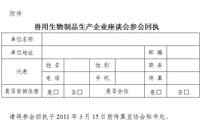 各重大动物疫病疫苗定点生产企业: 为进一步增强我国兽用生物制品生产企业诚信自律意识,建立自律机制,规范经营行为,保障行业安全,维护行业整体利益。中国动物保健品协会邀请重大动物疫病疫苗定点生产企业负责人举办座谈会,共同探讨规范我国兽用生物制品市场秩序的具体措施。会议具体安排如下: 一、会议时间 二、会议地点 北京湖北大厦三峡厅;总 机:010-62172288 北京市海淀区中关村南大街36号 三、会议内容 1.    探讨构建我国重大动物疫病疫苗市场公平、有序竞争机制 2.    探讨我国兽用生物制品的行业安全相关问题 四、参会人员 各重大动物疫病疫苗定点生产企业负责人 五、会议费用 会务费、餐费由协会负责,住宿费、交通费自理 六、乘车路线 1.首都机场:乘机场大巴-友谊宾馆-乘出租车至湖北大厦; 2.北京西站:乘320、319、695、特4、特6路公交至中央民族大学下车; 3.北京站:乘地铁2号线至西直门,换乘地铁4号线至国家图书馆站,B出口北行 七、联系方式 联系人:黄逢春   杨薇 电  话:010-62103997   010-62103991-612 Email:cahpahy@cahpa.org.cn 附件:兽用生物制品生产企业座谈会参会回执                             二〇一一年三月三日  |