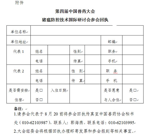 附件:第四届中国兽药大会猪瘟防控技术国际研讨会    参会回执(下载附件可点击下图)  |