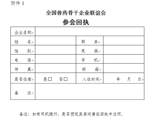 附件:1.全国兽药骨干企业联谊会参会回执(点击下载)