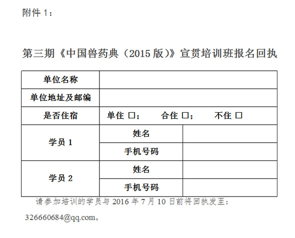 《中国兽药典(2015年版)》(以下简称《新版兽药典》)实施在即,为积极配合有关部门做好《新版兽药典》宣贯工作,我会与山东省兽药协会联合举办第三期《中国兽药典(2015版)》培训班。现就有关事项通知如下。 一、 培训对象 山东、江苏、安徽、浙江、上海五省(市)兽药生产、经营企业及科研单位专业技术人员,其他片区培训具体时间及地点另行通知。 二、培训内容 (一)《中国兽药典》2015版编制及兽药国家标准管理概况; (二)《中国兽药典》2015版一部主要增修订内容; (三)《中国兽药典》2015版一部解读(化学药品); (四)《中国兽药典》2015版一部解读(抗生素); (五)《中国兽药典》2015版二部主要增修订内容; (六)《中国兽药典》2015版二部解读; 三、培训时间 2016年7月14、15两天;13日全天报道 四、培训地点 酒店名称: 济南舜和国际酒店 地 址:济南市槐荫区经十路26008号(段店立交桥东侧) 电 话:(0531)81618666 五、培训费用 参加培训的中国兽药协会会员单位学员1800元/人,非会员单位学员2000元/人(含培训费、资料费、餐费等),交通费、住宿费自理,住宿统一安排,标间350元/间/天 。 六、缴费方式 请参加培训的学员将培训费汇入如下账号: 开户名:中国兽药协会 开户行:农业银行北京白石桥支行 账 号:11050501040000149 备注:对提前交费的,可在现场报到时领取正式发票,并请在汇款单备注上注明单位名称和学员姓名。对现场交费的(仅收现金),现场开具收据,正式发票将随后寄出。 七、联系人及联系电话 张雄方竹:010-62103991-611 黄逢春:010-62103998 附件:1. 第三期《中国兽药典(2015版)》宣贯培训班报名回执 2. 济南舜和国际酒店乘车路线
