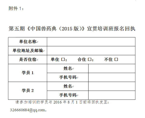 《中国兽药典(2015年版)》(以下简称《新版兽药典》)实施在即,为积极配合有关部门做好《新版兽药典》宣贯工作,我会与山西省动物保健品协会联合举办第五期《中国兽药典(2015版)》培训班。现就有关事项通知如下。 一、 培训对象 黑龙江、吉林、辽宁、山西、内蒙古五省(市、区)兽药生产、经营企业及科研单位专业技术人员,其他片区培训具体时间及地点另行通知。 二、培训内容 (一)《中国兽药典》2015版编制及兽药国家标准管理概况; (二)《中国兽药典》2015版一部主要增修订内容; (三)《中国兽药典》2015版一部解读(化学药品); (四)《中国兽药典》2015版一部解读(抗生素); (五)《中国兽药典》2015版二部主要增修订内容; (六)《中国兽药典》2015版二部解读; 三、培训时间 2016年8月7、8两天;6日全天报道 四、培训地点 酒店名称:山西人大会议中心 地 址:山西省太原市迎泽区迎泽大街309号 电 话:0351-2465333/666/999 五、培训费用 参加培训的中国兽药协会会员单位学员1800元/人,非会员单位学员2000元/人(含培训费、资料费、餐费等),交通费、住宿费自理,住宿统一安排,标间268元/间/天 。 六、缴费方式 请参加培训的学员将培训费汇入如下账号: 开户名:中国兽药协会 开户行:农业银行北京白石桥支行 账 号:11050501040000149 备注:对提前交费的,可在现场报到时领取正式发票,并请在汇款单备注上注明单位名称和学员姓名。对现场交费的(仅收现金),现场开具收据,正式发票将随后寄出。 七、联系人及联系电话 张雄方竹:010-62103991-611 黄逢春:010-62103998 附件:1. 第五期《中国兽药典(2015版)》宣贯培训班报名回执 2. 山西人大会议中心乘车路线