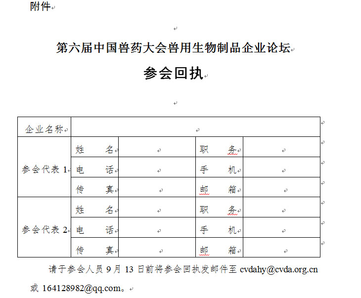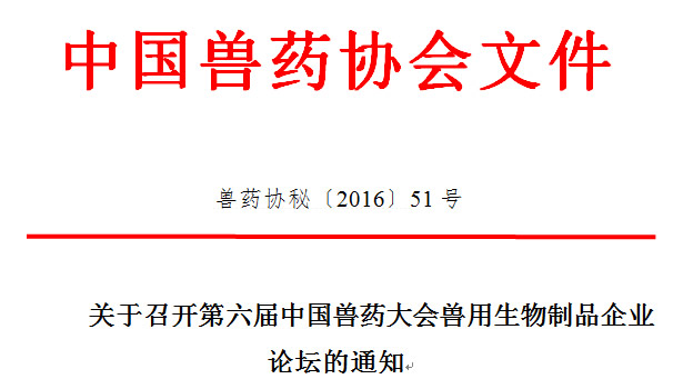 中牧实业股份有限公司由中国兽医药品监察所和中国兽药协会主办的第六届中国兽药大会定于2016年9月18日至19日在成都世纪城新国际会展中心召开。兽用生物制品企业论坛作为大会的专业分论坛之一,将邀请行业主管部门领导、业内外企业专家做专题报告。具体通知如下: 一、组织机构 主办单位:中国兽药协会 承办单位:中国兽药协会生物制品专业委员会 协办单位:乾元浩生物股份有限公司 北京天信和生物科技公司 哈尔滨中意制药机械有限责任公司 道达尔石油(上海)有限公司 二、论坛时间 2016年9月19日08:30-13:00 三、论坛地点 成都十八步岛酒店综合楼二层相盈厅 四、论坛内容 1.兽用生物制品研发体系建设 ——中国农业科学院哈尔滨兽医研究所所长步志高 2.如何为用户创造价值 ——青岛易邦生物工程有限公司董事长杜元钊 3.兽用生物制品供给侧改革——以金宇保灵生物药品 有限公司口蹄疫疫苗市场化为例 ——金宇保灵生物药品有限公司总经理王永胜 4.融合科技与资本推动产业整合 ——天津瑞普生物技术股份有限公司董事长李守军 5.汇聚世界创新智源 打造全球品牌经典 ——北京大北农科技集团股份有限公司动物医学研究中心总经理赵亚荣 6.兽药产业发展现状、趋势及对策 ——普莱柯生物工程股份有限公司董事长张许科 7.中牧股份口蹄疫合成肽疫苗研发进展 ——中牧实业股份有限公司研究院常务副院长齐鹏 8.球虫疫苗的应用意义与技术进展 ——天津赫莱恩特生物科技有限公司总经理陈庆忠 9.疫苗检测常见问题分析 ——北京中海生物科技有限公司总经理助理李琳 10.常用细胞悬浮培养技术及生物反应器生产线建设 ——北京天信和生物科技公司总经理王建超 11.道达尔精制白油在动物疫苗中的应用 ——道达尔石油(上海)有限公司总经理周东伟 12.没有新金融支持的农牧企业能做大吗? ——厚朴金融控股有限公司董事长李书文 13.农业保险与农业产业链协同发展 ——华农财产保险有限公司总经理张宗韬 14.阿里大生态助理“互联网+农牧”产业变革 ——阿里巴巴集团乡村事业部农村生产中心商家合作部总经理王延哲 15.动保行业全球何去何从?——我们的责任与机遇 ——勃林格殷格翰动物保健大中华区副总裁郎世峰 五、参会人员 (一)兽用生物制品生产、经营、研发及相关企业董事长、总经理及有关负责人等; (二)本论坛参会人员为150人(每个企业限报2名,参加人员由我会邮件通知报名成功。 六、其他 (一)本次论坛不收取任何费用,提供9月19日午餐。 (二)联系方式 中国兽药协会秘书处会员部 杨 薇:010-62103991转612 张 莉:010-62103992、15801368281 Email:cvdahy@cvda.org.cn或164128982@qq.com 请于参会代表9月13日前将参会回执(附件)发邮件至协会秘书处。 附件:第六届中国兽药大会兽用生物制品企业论坛参会回执