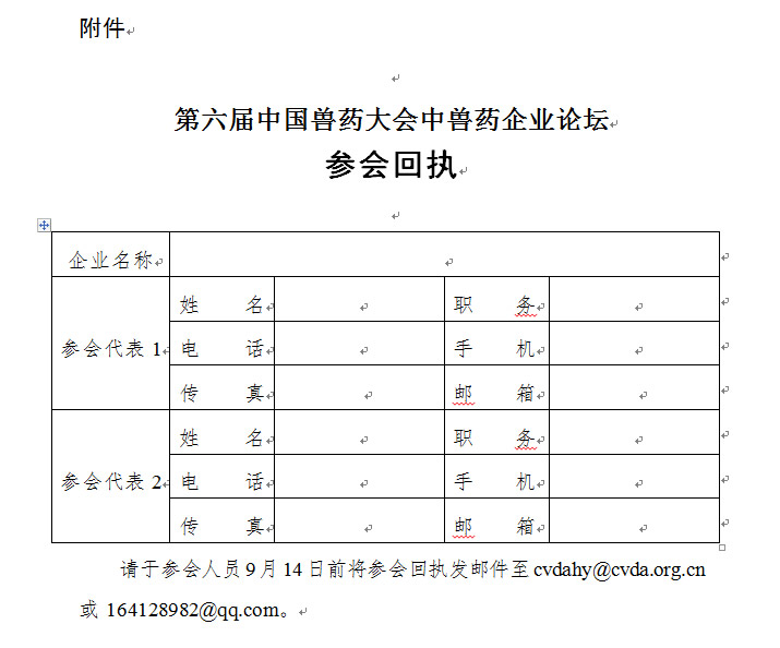 四川恒通动物制药有限公司由中国兽医药品监察所和中国兽药协会主办的第六届中国兽药大会定于2016年9月18日至19日在成都世纪城新国际会展中心召开。中兽药论坛作为大会的专业分论坛之一,将邀请行业主管部门领导、业内外专家做专题报告。具体通知如下: 一、组织机构 主办单位:中国兽药协会 承办单位:中国兽药协会中兽药产业推进委员会 协办单位:四川恒瑞通达生物科技有限公司 保定冀中药业有限公司 河南省康星药业股份有限公司 二、时间 2016年9月19日08:30-12:00 三、地点 成都十八步岛酒店综合楼四层相成厅 四、内容 (一)专题报告 1.现代中兽医发展史——纪念周恩来总理“加强民间兽医工作”指示六十周年 ——北京农学院教授穆祥 2.从评审现状看中兽药研发 ——中国兽医药品监察所标准处副处长巩忠福 3.宠物用中兽药现状及发展趋势 ——中国农业大学教授刘钟杰 4.生产高标准、高品质中药提取物的技术要求 ——四川恒瑞通达生物科技有限公司总经理卜发玉 5.传统中药与现代工艺结合 ——保定冀中药业有限公司研发总监许冠英 6.中兽药超微粉的研究与应用 ——河南牧业经济学院教授、河南省康星药业股份有限公司董事长张国祖 (二)主题讨论 主讲专家及行业有关专家与参会人员针对“中兽药产业的发展趋势”进行讨论。 五、参会人员 (一)中兽药生产及相关企业的负责人; (二)本论坛参会人员为130人(每个单位限报3名,参加人员由我会邮件通知报名成功。 六、其他 (一)本论坛不收取费用。 (二)联系方式 中国兽药协会秘书处会员部 杨 薇:010-62103991转612 张 莉:010-62103992、15801368281 Email:cvdahy@cvda.org.cn或164128982@qq.com 请于参会代表9月14日前将参会回执(附件)发邮件至协会秘书处。 附件:第六届中国兽药大会中兽药论坛参会回执
