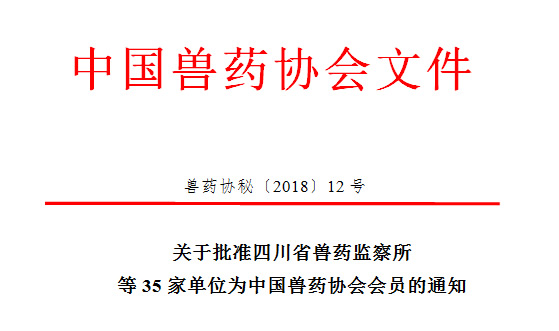 根据《中国兽药协会章程》和《中国兽药协会会员管理办法》的相关规定,经2018年1月18日至1月24日以通信形式召开了五届十二次常务理事会审议决定,批准四川省兽药监察所等35家单位为中国兽药协会单位会员(名单附后)。 望新入会的会员认真遵守协会章程,行使会员权力,履行会员义务,积极参加协会活动,为促进我国兽药行业健康稳定发展作出应有贡献。
