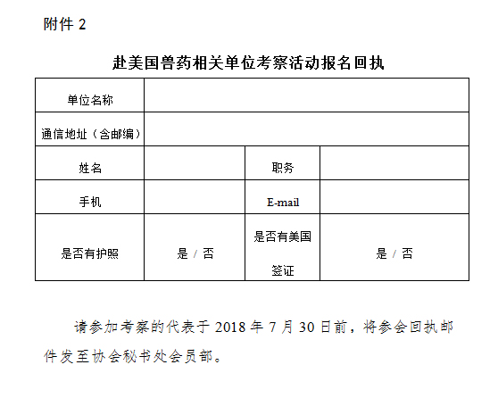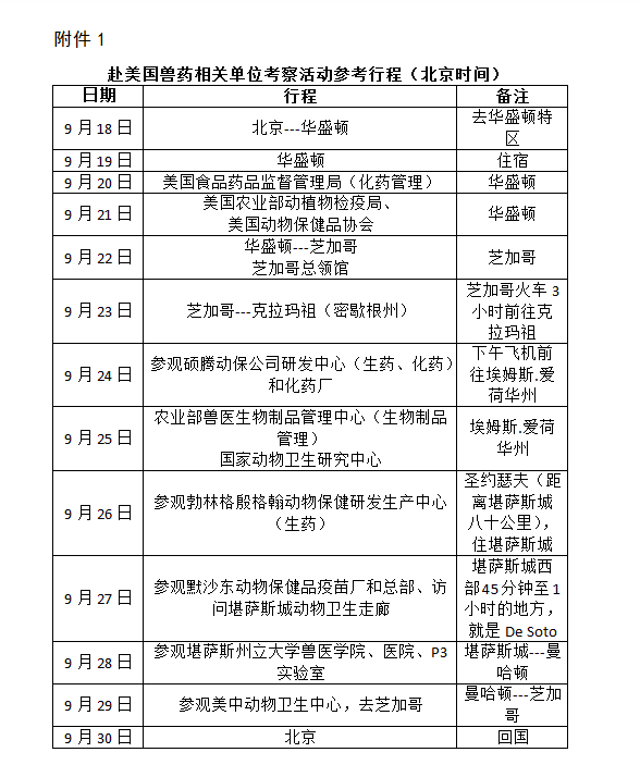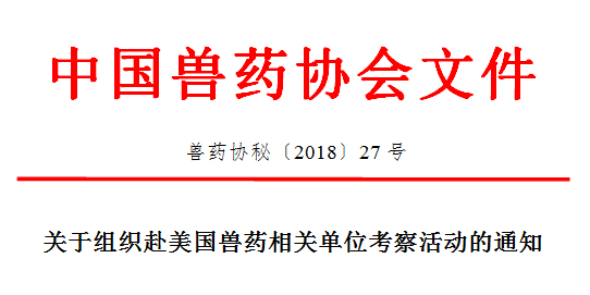 为加强国际交流,提升会员企业国际影响力,经联系,并应美国堪萨斯州立大学美中动物卫生中心的邀请,协会拟组织赴美国兽药相关单位考察活动。现通知如下: 一、主办单位 中国兽药协会 二、协办单位 美国堪萨斯州立大学美中动物卫生中心 三、考察内容 拜访美国食品药品监督管理局、美国农业部动植物检疫局、美国动物保健品协会、美国堪萨斯州立大学兽医学院和美中动物卫生中心等单位,与有关专家进行交流;参观硕腾动保、勃林格殷格翰动物保健、默沙东动物保健生产厂和研发中心,与公司代表座谈。 四、考察时间 2018年9月18日至30日 五、组团及报名方法 拟定初步考察人数18至20人,按照报名顺序进行电话确认。持有美国签证者优先。 六、收费标准及汇款方式 1. 费用标准:预收考察费用68000元人民币/人,费用包含交通、餐饮、住宿(四星级酒店双床房,对住房有特殊要求的代表需补交差价)及参观考察等,实际发生费用多退少补。 2. 汇款方式:另行通知。 七、注意事项 报名参加考察代表需提供个人护照首页照片,美国堪萨斯州立大学美中动物卫生中心发邀请函,自行办理签证。 八、联系方式 中国兽药协会秘书处会员部 联系人: 董微: 13718826893 /010 -62103990 -601 张莉: 15801368281/010-62103992 E-mail:cvdagj@cvda.org.cn 附件:1. 赴美国兽药相关单位考察活动参考行程 2. 赴美国兽药相关单位考察活动报名回执 中国兽药协会 2018年7月26日 ![]() ![]()