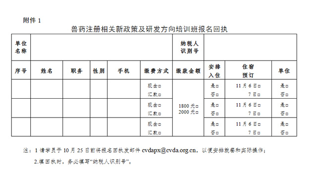 三、培训内容 (一)近期相关评审政策措施解读; (二)网上评审系统介绍; (三)第二批比对试验目录解读; (四)化药注册审查中发现的常见问题; (五)中兽药注册审查中发现的常见问题; (六)中兽药研发思路; (七)当前宠物用药应用状况及硏发方向。 四、培训费用 协会会员单位学员1800元/人,非会员单位学员2000元/人(含培训费、资料、餐费),住宿统一安排,费用自理。住宿费:328元/间(标间),不含早(早餐28元/人) 五、联系人及联系方式 联系人及电话 董微:010-62103990-601、13718826893 张莉:010-62103992、15801368281 六、缴费方式 (一)银行汇款 请于2019年10月25日前将培训费用汇入如下账号: 开户名:中国兽药协会 开户行:农业银行北京白石桥支行 账 号:11050501040000149 (二)现场缴费 现场交费的学员可收现金或微信扫码形式支付,现场开具 收据,正式发票培训结束后邮寄。 附件:1.兽药注册相关新政策及研发方向培训班报名回执 2.农广中心地址及乘车路线