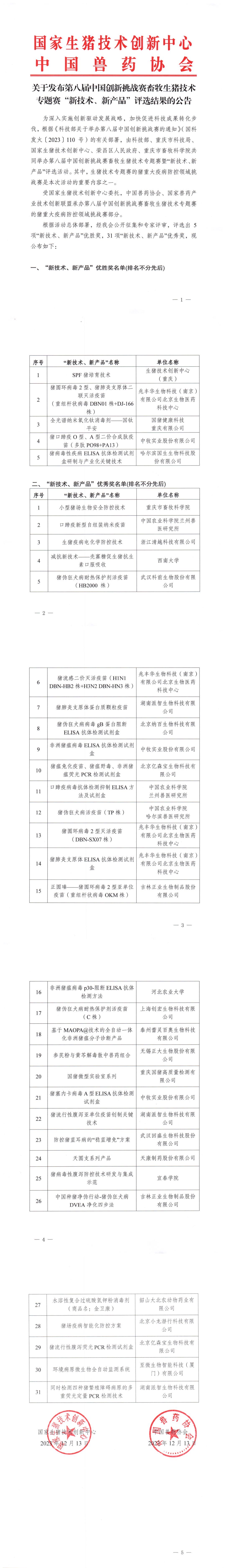 关于发布第八届中国创新挑战畜牧生猪技术专题赛“新技术、新产品”评选结果的公告