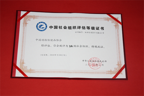 根据民政部《全国性民间组织评估实施办法》的规定和《关于进一步开展全国性行业协会商会评估工作的通知》要求,中国动物保健品协会于2009年8月向民政部提出申请,参加2009年全国行业协会商会等级评估。民政部行业协会商会评估专家小组和评估委员会,依照行业协会商会评估指标和评估工作程序,从基础条件、内部治理、工作绩效和社会评价四个方面对我会进行了综合评判和现场考评。经过行业协会商会评估专家小组初评和评估委员会终评,并经民政部网上公示,我会被评定为全国行业协会商会评估3A等级,民政部于2010年2月23日发布了《2009年全国性行业协会商会评估等级结果公告》(民政部公告168号),向社会予以公布。