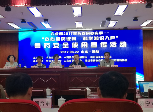 6月22日,由农业部兽医局、中国兽医药品监察所、山东省畜牧兽医局主办,中国兽药协会、山东省兽药协会、潍坊市畜牧兽医局、潍坊市兽药协会共同承办的“放心兽药进村、科学知识入户”兽药安全使用宣传活动在山东潍坊成功举办。活动的主题是:兽药安全科普知识下乡,保证养殖合理规范用药。此次活动是兽医系统2017年为农民办实事的重要举措,也是农业部深化农业行政审批制度改革“放、管、服”工作的重要内容。