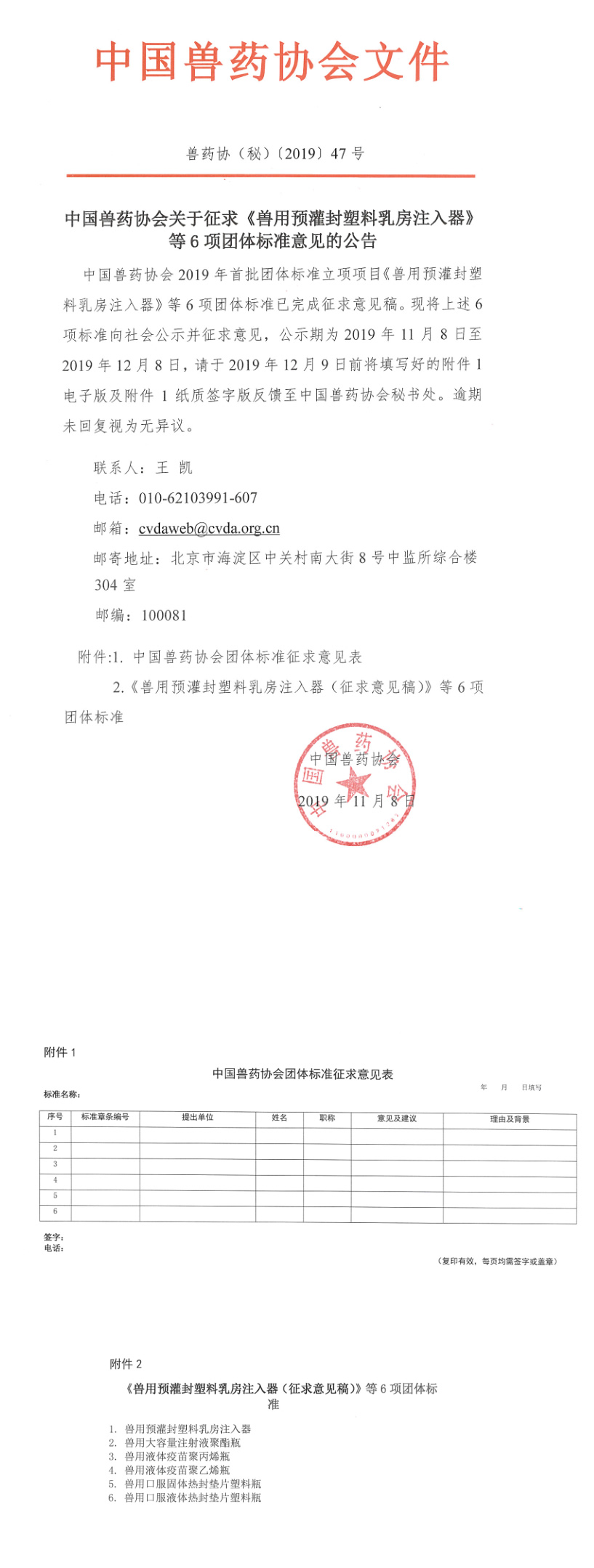 中国兽药协会关于征求《兽用预灌封塑料乳房注入器》等6项团体标准意见的公告.pdf