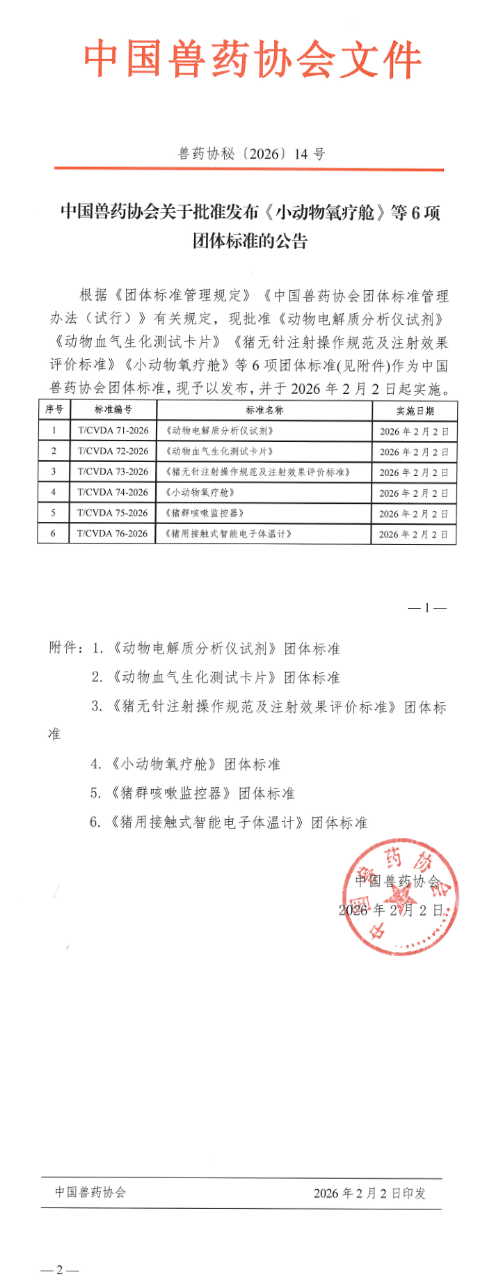 中国兽药协会关于批准发布《小动物氧疗舱》等6项团体标准的公告