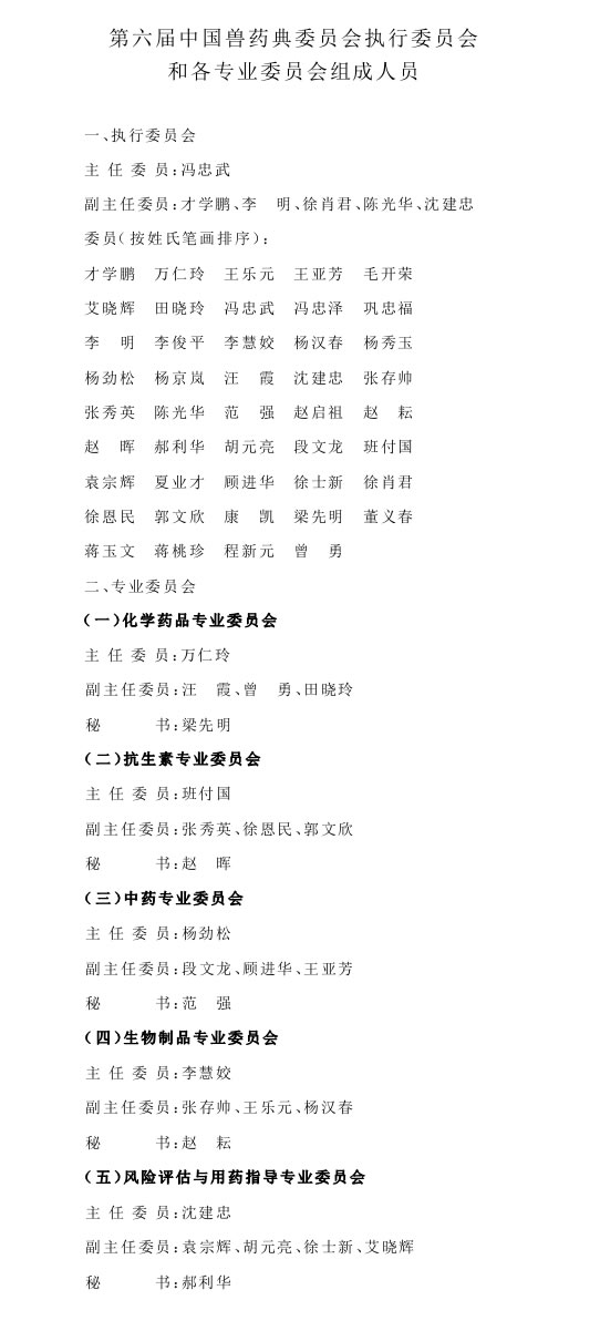 为做好《中国兽药典》(2020年版)编制工作,根据第六届中国兽药典委员会提议,经审核,现公布第六届中国兽药典委员会章程和第六届中国兽药典委员会执行委员会、专业委员会组成人员名单。 特此公告。 附件:1.第六届中国兽药典委员会章程 2.第六届中国兽药典委员会执行委员会和各专业委员会组成人员名单 农业部 2017年8月28日 附件: |