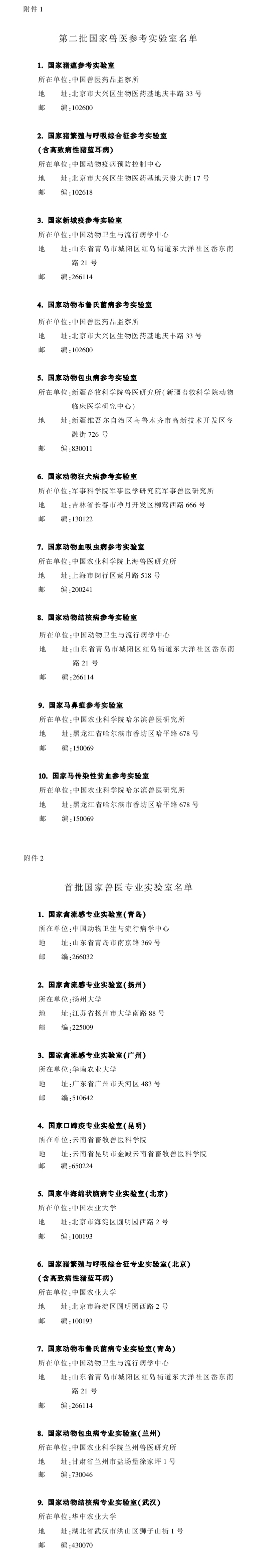 为贯彻落实《国家防治动物疫病中长期规划(2012—2020年)》,进一步加强国家兽医实验室体系建设,根据《国家兽医参考实验室管理办法》《农业部关于进一步加强国家兽医参考实验室管理的通知》(农医发﹝2016﹞13号),我部指定了猪瘟等10种优先防治动物疫病实验室为第二批国家兽医参考实验室和相关专业实验室为首批国家兽医专业实验室。现予以公告。