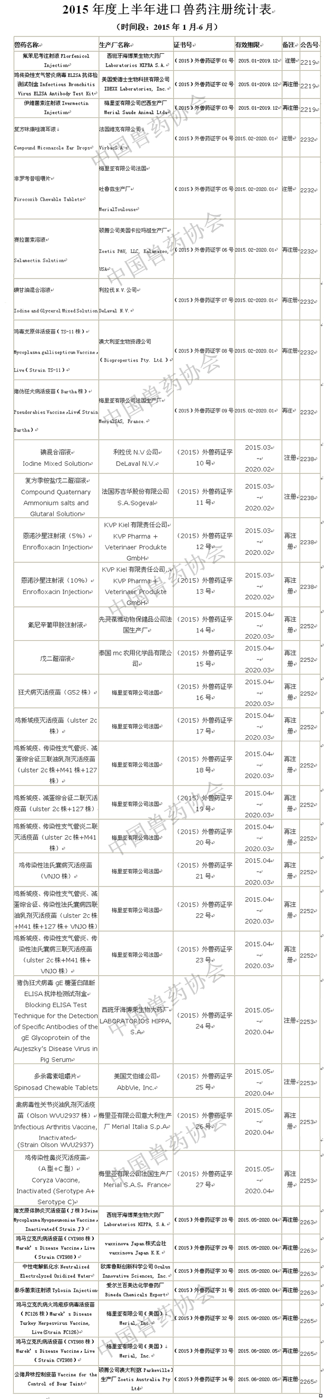 2015年度上半年进口注册兽药统计表