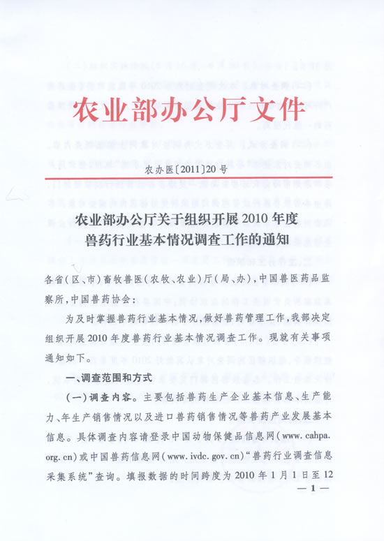 农业部办公厅关于组织开展2010年度兽药行业基本情况调查工作的通知