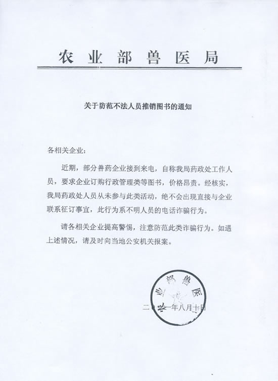 农业部兽医局--关于防范不法人员推销图书的通知