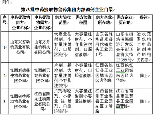 根据《兽药生产质量管理规范》、农业部公告第954号和《农业部办公厅关于中兽药提取物委托加工生产有关事宜的通知》(农办医[2010]8号)有关规定,经审核,现公布第八批《中药提取物兽药集团内部调剂企业目录》(见附件,以下简称《调剂企业目录》),并就有关事项通知如下。