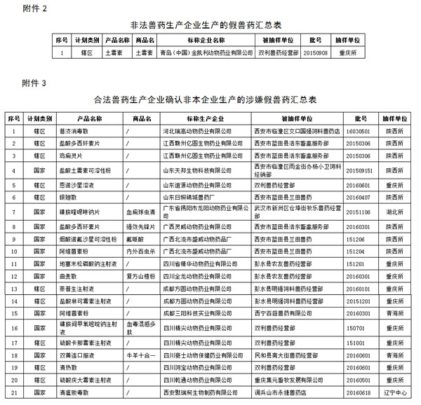 近日,重庆市兽药饲料检测所等5个省级兽药检验机构报送了经抽样确认的2017年3月兽药监督抽检中发现的22批假兽药相关信息。其中,非法兽药生产企业1家(附件1),涉及假兽药1批(附件2);合法兽药生产企业确认非本企业生产的涉嫌假兽药21批(附件3)。各级兽医行政管理部门要严格按照兽药违法行为从重处罚规定(农业部公告第2071号)和以下要求组织查处,我部将定期通报结果。 一、对附件1所列非法兽药生产企业,要立案排查,依法打击造假窝点和经销渠道。 二、对附件2所列假兽药和附件3所列涉嫌假兽药,要立案查处,依法组织清缴销毁,并对兽药经营单位违法行为依法实施处罚。要加强假兽药来源的追溯和排查,依法打击造假窝点和经销渠道。 三、对附件3所列标称兽药生产企业,要迅速组织核查,发现附件3所列涉嫌假兽药的,依法从重处罚。 四、各地要按照《农业部办公厅关于进一步加强兽药违法案件查处及信息报送工作的通知》(农办医〔2016〕16号)要求,及时将查处情况报我部兽医局。 附件:1.非法兽药生产企业名单 2.非法兽药生产企业生产的假兽药汇总表 3.合法兽药生产企业确认非本企业生产的涉嫌假兽药汇总表 农业部