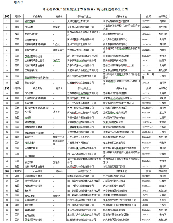 在2017年9月兽药监督抽检过程中,江苏省兽药饲料质量检验所等10个省级检验机构经抽样确认,发现了39批假兽药相关信息。其中,非法兽药生产企业2家(附件1),涉及假兽药2批(附件2);合法兽药生产企业确认非本企业生产的涉嫌假兽药37批(附件3)。各级兽医行政管理部门要严格按照兽药违法行为从重处罚规定(农业部公告第2071号)和以下要求组织查处。 一、对附件1所列非法兽药生产企业,要立案排查,依法打击造假窝点和经销渠道。 二、对附件2所列假兽药和附件3所列涉嫌假兽药,要立案查处,依法组织清缴销毁。要求有关兽药经营单位立即下架所列兽药,并对其违法行为依法实施处罚。要加强假兽药来源的追溯和排查,依法打击造假窝点和经销渠道。 三、对附件3所列标称兽药生产企业,要迅速组织核查,发现附件3所列涉嫌假兽药的,依法从重处罚。 四、各地要按照《农业部办公厅关于进一步加强兽药违法案件查处及信息报送工作的通知》(农办医〔2016〕16号)要求,及时将查处情况报我部兽医局,我部将适时通报查处结果。 附件:1.非法兽药生产企业名单 2.非法兽药生产企业生产的假兽药汇总表 3.合法兽药生产企业确认非本企业生产的涉嫌假兽药汇总表