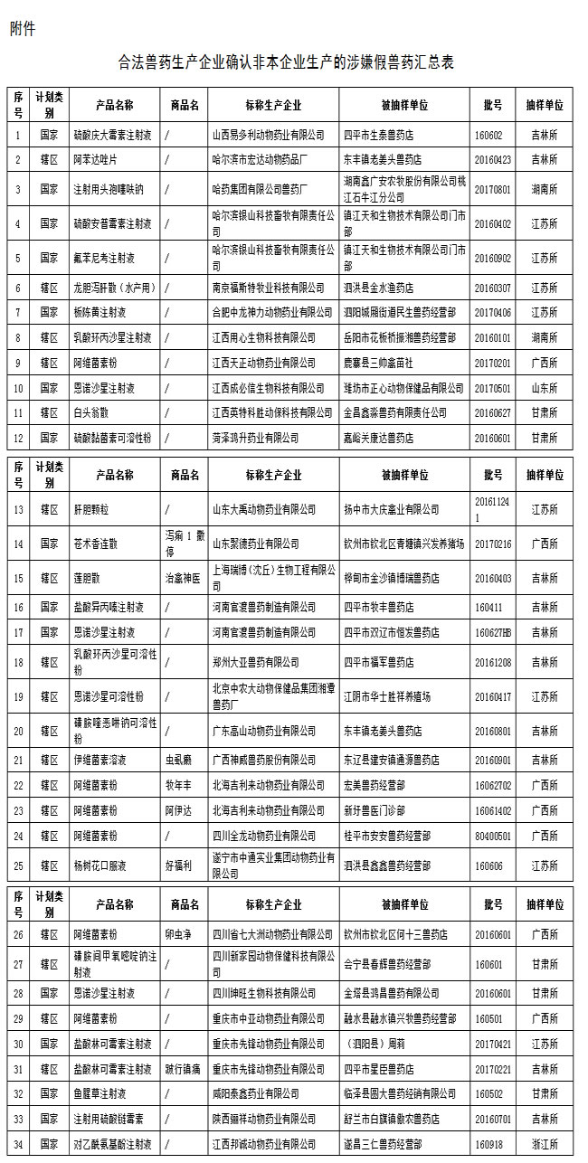 近日,吉林省兽药监察所等7个省级兽药检验机构报送了经抽样确认的2017年11月兽药监督抽检中发现的34批假兽药(附件)相关信息,全部为合法兽药生产企业确认非本企业生产的涉嫌假兽药。各级兽医行政管理部门要严格按照从重处罚兽药违法行为公告(农业部公告第2071号)规定,对列入附件的涉嫌假兽药立案查处;加强对涉嫌假兽药来源的追溯和排查,依法打击造假窝点和经销渠道;对列入附件的标称兽药生产企业,迅速组织核查,发现所列涉嫌假兽药的,一律依法从重处罚。 各地要按照《农业部办公厅关于进一步加强兽药违法案件查处及信息报送工作的通知》(农办医〔2016〕16号)要求,及时将查处情况报我部兽医局,我部将适时通报查处结果。 附件:合法兽药生产企业确认非该企业生产的涉嫌假兽药汇总表