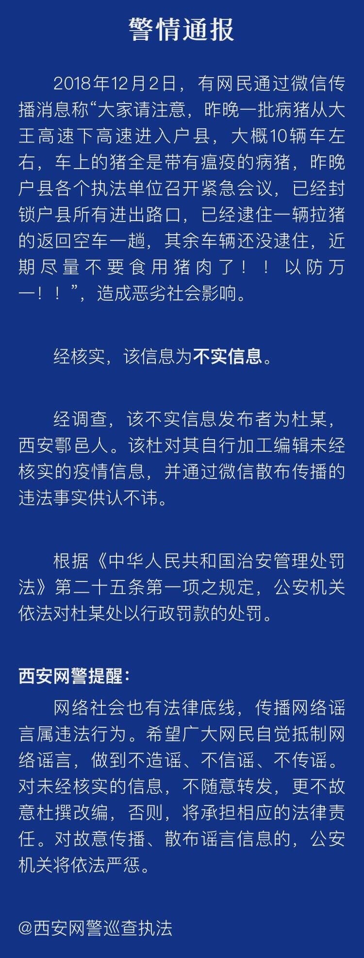 关于网民通过微信散布西安鄠邑区瘟疫猪谣言信息的警情通报