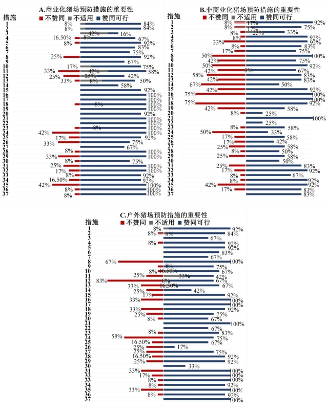 预防措施重要性的评估 共有12名专家对筛选的防御措施进行了重要性评估。评估结果见图1。 通过文献综述和专家评估,归纳出三个重点预防措施可有效减缓非洲猪瘟在家猪群中的传播:一是控制猪场猪只及人员的进入;二是严格控制猪饲料;三是提升健康服务和培训。 第一方面的措施围绕产品的运输和周边感染野猪排毒进行预防。欧盟国家卫生和食品安全总局最新的工作主要围绕提高后备猪群、猪舍设计和管理实践的生物安全措施,尤其是对猪舍中设施的清洗和消毒。 ![]() ![]() 图1 预防措施的评估结果(A)商业化猪场(B)非商业化猪场(C)户外猪场 第二大方面预防措施是避免摄入非洲猪瘟感染的饲料来减少非洲猪瘟的传播。欧盟禁止饲喂泔水,所有专家一致认为这对防止非洲猪瘟的传播至关重要。 第三大方面预防措施是提升健康服务及培训。尤其在非商业化猪场,人为错误或缺少非洲猪瘟传播的相关知识,重视力度不足,都是导致非洲猪瘟流行的原因。方便快捷地接受兽医的健康服务和培训项目,尤其是针对非洲猪瘟的鉴定及预防措施进行培训是预防非洲猪瘟传播的必要工具。 小结 非洲猪瘟对目前欧洲生猪养殖是主要威胁之一。因为没有有效的疫苗,生物安全防控是防止非洲猪瘟在猪群间传播的主要手段。本文筛选出37种有效的预防措施用于减缓非洲猪瘟在猪群中的传播,并进行了评估,执行以上的预防方式可有效预防和控制非洲猪瘟的传播,并有可能净化非洲猪瘟,以期为现阶段我国的非洲猪瘟疫情的防控提供参考。 http://www.moa.gov.cn/ztzl/fzzwfk/fkzs/201901/t20190115_6166675.htm (责任编辑:admin) |