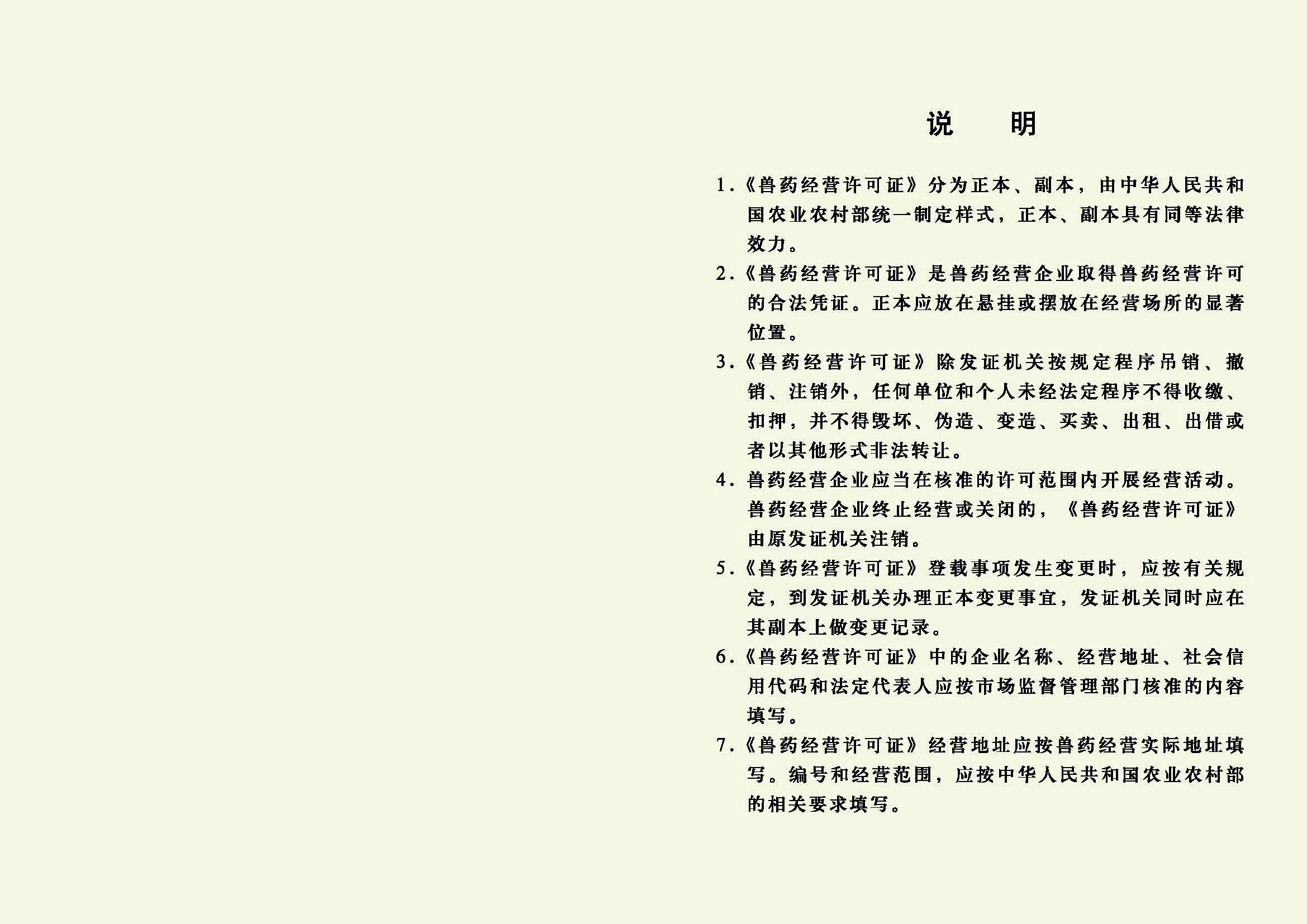 中华人民共和国农业农村部公告 第581号为进一步完善兽药生产、经营许可证核发工作,加强兽药生产、经营环节监管,我部修订了《兽药生产许可证》《兽药经营许可证》《兽药GMP证书》样式,现予以发布,自2022年9月1日起启用,并就有关事项公告如下。 一、新版《兽药生产许可证》《兽药经营许可证》设立正本、副本,具有同等法律效力,是兽药生产或经营企业取得相应许可的合法凭证,正本悬挂和摆放在生产或经营场所显著位置,副本用于记载企业相关内容的变更情况。 二、新版《兽药生产许可证》证号格式为“兽药生产证字XXXXX号”,其中数字为5位,由企业所在省份序号(2位,以原农业部公告第452号公布的省份序号为准)和企业序号(3位,省份内排序)组成。 新版《兽药经营许可证》证号格式为“兽药经营证字XXXXXXXXX号”,其中数字为9位,由企业所在省份序号(2位,以原农业部公告第452号公布的省份序号为准)、县级以上行政区域序号(4位,各省份统一编制并发布)及企业序号(3位,县级行政区域内排序)组成。 新版《兽药GMP证书》证号格式继续按照农办医〔2015〕11号文件执行。 三、新版《兽药经营许可证》的经营范围表述应为:兽用中药、化学药品;兽用生物制品(应载明国家强制免疫用生物制品或非国家强制免疫用生物制品);兽用特殊药品(兽用麻醉药品、兽用精神药品、兽用易制毒化学药品、兽用毒性药品、兽用放射性药品等);兽用原料药。 四、此前各级农业农村部门核发的旧版《兽药生产许可证》《兽药经营许可证》《兽药GMP证书》,在换发前继续有效。