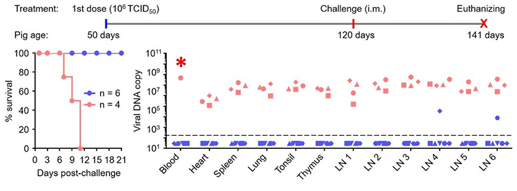 中国农业科学院哈尔滨兽医研究所国家非洲猪瘟专业实验室按照农业农村部及中国农业科学院党组工作部署,依托兽医生物技术国家重点实验室和国家动物疫病防控高级别生物安全实验室,围绕非洲猪瘟防控需求开展科技攻关,创制了一种非洲猪瘟弱毒活疫苗,经系统实验室研究评价,该疫苗对家猪具有良好的安全性和有效性。相关研究成果以 “A seven-gene-deleted African swine fever virus is safe and effective as a live attenuated vaccine in pigs”为题目,已在线发表在SCIENCE CHINA Life Sciences(《中国科学:生命科学》英文版)。 基因缺失减毒活疫苗被认为是非洲猪瘟疫苗最有希望的研发技术策略。研究人员以我国第一株非洲猪瘟病毒分离株Pig/HLJ/2018为骨架,利用同源重组技术构建了一系列具有不同基因缺失的重组病毒(图1)。通过在猪体内进行系统的致病力、免疫原性和免疫保护性试验,遴选出一株具有7个基因缺失的病毒(HLJ/18-7GD)符合弱毒活疫苗安全性标准,可对非洲猪瘟强毒的致死性攻击提供有效免疫保护(图2)。