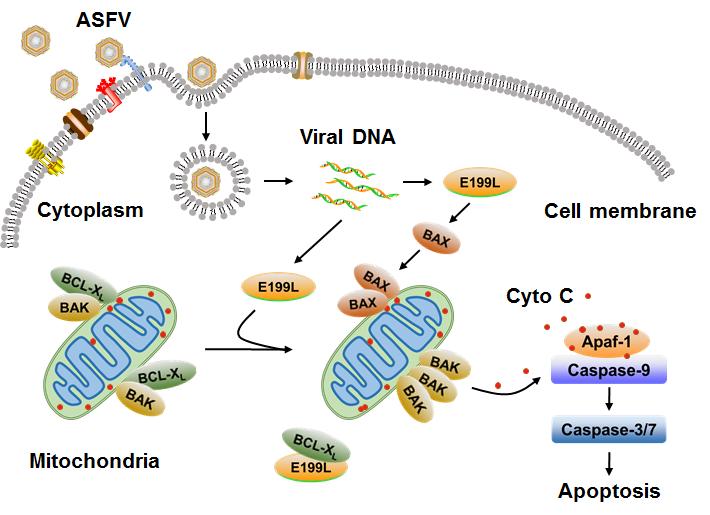 利用双荧光素酶报告基因系统筛选了ASFV 编码的102个蛋白对干扰素启动子活性的影响,科研人员发现ASFV编码的E2泛素结合酶(pI215L)对干扰素产生的抑制作用最为显著。利用siRNA敲低pI215L的表达显著抑制了ASFV的复制,但增强了ASFV诱导的IFN-β和ISG56的产生。利用免疫共沉淀联合质谱实验,我们发现与pI215L相互作用的E3泛素连接酶RNF138。pI215L通过招募RNF138并促进RNF138降解RNF128,进而抑制RNF128对TBK1的K63位泛素化修饰,最终抑制IFN-β产生。这些研究成果阐明了ASFV免疫逃逸的一种新机制,将为ASFV减毒疫苗的研制提供线索。 3. 发现非洲猪瘟病毒新的细胞凋亡诱导基因 细胞凋亡在病毒感染、复制和致病机制中起着非常重要的作用。2021年11月9日,哈尔滨兽医研究所发现一个非洲猪瘟病毒基因的新功能,并在其诱导细胞凋亡的机制上取得新进展。科研人员发现并证实非洲猪瘟病毒的pE199L基因是一个新的细胞凋亡相关基因,能够诱导线粒体依赖性的细胞凋亡,相关研究结果以“African swine fever virus pE199L induces mitochondrial-dependent apoptosis”为题,发表在《Viruses》杂志上。 ASFV感染猪后,临床特征表现为感染的组织内大量细胞死亡以及淋巴细胞枯竭,然而该病毒感染引起细胞死亡的分子机制目前仍不清楚。研究人员从ASFV编码的94个蛋白中筛选并鉴定出4个病毒蛋白能够引起细胞死,其中pE199L的作用最为显著。体外实验结果表明,在猪源细胞(CRL-2843)和人源细胞(HEK293T和HeLa)中,异源表达的pE199L可显著诱导细胞死亡,并且表现出明显的细胞凋亡特征,包括核皱缩、核DNA片段化、凋亡小体形成等。而在ASFV感染过程中,下调pE199L的表达可明显降低细胞的死亡。另外,pE199L的表达导致线粒体膜电位势能下降,细胞色素C释放以及凋亡相关激酶caspase-9和-3/7的激活,说明pE199L通过线粒体凋亡途径诱导细胞死亡。