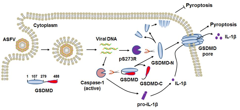 进一步研究发现,pE199L能够与BCL-2凋亡家族的抗凋亡成员(如BCL-XL、MCL-1、BCL-W、BCL-2A1)相互作用,并且与BAK竞争结合BCL-XL,从而促进BAK和BAX的活化,最终引起线粒体依赖性细胞凋亡。本研究为进一步了解非洲猪瘟病毒的致病机制提供了新的线索。 4. 发现了非洲猪瘟病毒pS273R蛋白抑制细胞焦亡的机制 病毒感染诱导炎症反应及其负调控机制一直是免疫学研究的前沿和重点。2021年11月15日,哈尔滨兽医研究所在非洲猪瘟病毒感染诱导炎症的负反馈机制研究上再次取得新进展。科研人员发现,非洲猪瘟病毒pS273R能够通过非典型切割Gasdermin D从而抑制细胞焦亡,相关研究结果以“African Swine Fever Virus pS273R Inhibits Pyroptosis by Non-canonically Cleaving Gasdermin D”为题,将发表在《Journal of Biological Chemistry》杂志上。 非洲猪瘟病毒基因组是一个长链双链DNA,编码超过150种蛋白质,其中一些蛋白质不仅参与病毒的生命周期,还参与病毒的免疫逃逸,但大部分蛋白的功能未知。初步研究发现ASFV编码的一种半胱氨酸蛋白酶pS273R能够结合细胞焦亡的执行蛋白Gasdermin D (GSDMD)。进一步的研究表明,非洲猪瘟病毒 pS273R依赖其酶活性特异性切割GSDMD的G107-A108位点,产生一个较短的GSDMD 氨基端片段(GSDMD-N1-107)。有趣的是,该片段与宿主细胞Caspase-1切割GSDMD产生的氨基端片段(GSDMD-N1-279)不同,GSDMD-N1-107不触发细胞焦亡或抑制非洲猪瘟病毒复制。进一步的鉴定结果显示 pS273R能够通过切割GSDMD阻碍细胞焦亡的发生,从而有利于病毒在宿主细胞内完成复制周期。这些研究成果揭示了一种未被认识到的非洲猪瘟病毒抑制细胞焦亡的机制,这突显了pS273R在炎症反应和非洲猪瘟病毒复制中的重要功能。