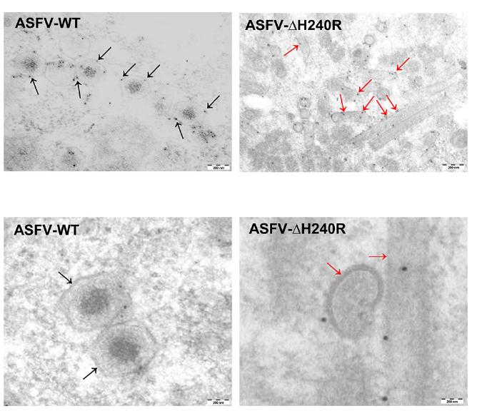 5. 发现影响非洲猪瘟病毒粒子形态的功能基因 非洲猪瘟病毒感染性颗粒的结构已经被解析,但是大多数病毒结构蛋白的定位及功能仍有待阐明。2021年11月17日,哈尔滨兽医研究所在非洲猪瘟病毒编码蛋白功能研究上取得新进展,科研人员首次发现非洲猪瘟病毒pH240R能够影响病毒粒子的组装从而降低子代病毒粒子的感染性,相关研究成果以“Deletion of the H240R Gene of African Swine Fever Virus Decreases Infectious Progeny Virus Production Due to Aberrant Virion Morphogenesis and Enhances the Inflammatory Cytokine Expression in Porcine Macrophages”为题,发表在《Journal of Virology》杂志上。 免疫电镜结果显示病毒的结构蛋白pH240R为衣壳蛋白,通过蛋白相互作用试验发现pH240R与主要衣壳蛋白p72存在相互作用。