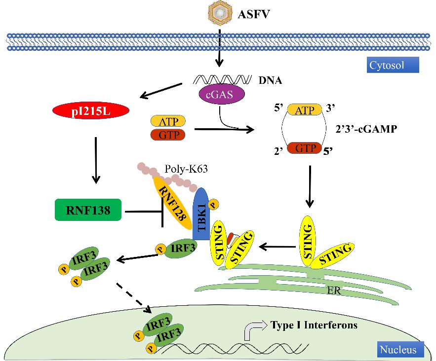 研究发现,非洲猪瘟病毒感染原代猪肺泡巨噬细胞能抑制多种刺激诱导的IL-1β和IFN-β的升高,提示非洲猪瘟病毒编码蛋白可能抑制IL-1β和IFN-β产生。通过筛选,研究人员发现非洲猪瘟病毒多基因家族(MGF)505/360多数成员对IL-1β和IFN-β产生具有抑制作用,其中pMGF505-7R的抑制作用最为显著。敲除MGF505-7R基因的重组病毒能够诱导更高水平的IL-1β和IFN-β的产生,表明pMGF505-7R对IL-1β和I型干扰素产生具有抑制作用。进一步研究发现pMGF505-7R通过与IKK复合物相互作用抑制IL-β基因的转录,并且其靶向NLRP3炎症复合体抑制IL-β的分泌。而在I型IFN信号通路中,pMGF505-7R靶向IRF3抑制I型IFN的产生。动物实验结果表明,缺失MGF505-7R基因的重组非洲猪瘟病毒对仔猪的致病力降低,感染猪血清中IL-1β和IFN-β的蛋白水平升高,而组织器官病毒载量显著降低。这些研究成果初步揭示了非洲猪瘟病毒的免疫逃逸的一种新策略,为非洲猪瘟病毒致病机制探索和疫苗的研发提供了新的理论依据。 2. 揭示了非洲猪瘟病毒免疫逃逸新的机制 非洲猪瘟病毒免疫逃逸机制与病毒的致病力和抗病毒猪的遗传育种密切相关。2021年11月10日,哈尔滨兽医研究所在非洲猪瘟病毒免疫逃逸机制研究上取得新进展,研究成果以 “African swine fever virus pI215L negatively regulates cGAS-STING signaling pathway through recruiting RNF138 to inhibit K63-linked ubiquitination of TBK1”为题,发表在《Journal of Immunology》杂志上,并被主编推荐为Top Read文章。该研究发现非洲猪瘟病毒编码的pI215L蛋白能够抑制Ⅰ型干扰素的产生,并阐明了该蛋白抑制Ⅰ型干扰素产生的分子机制。 先天免疫是宿主抵抗病原微生物感染的第一道防线,炎症反应和I型干扰素是先天免疫应答的重要成分,非洲猪瘟病毒感染如何逃逸宿主的先天免疫系统的监视,其与病毒致病力的关系尚不完全清楚。已有研究表明,ASFV拮抗干扰素(IFN)产生的基因与其致病力密切相关,缺失ASFV拮抗IFN产生的基因是研发ASFV疫苗的有效策略之一。