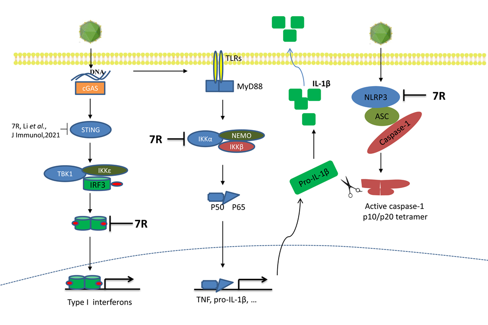 非洲猪瘟是由非洲猪瘟病毒感染猪引起的一种急性、高致死性传染病。该病自2018年传入我国,给我国养猪业带来了严重的经济损失。由于病毒感染和致病机制不清楚,而且缺乏商品化的疫苗和特效药物,非洲猪瘟的防控形势仍然异常严峻。因此,解析非洲猪瘟病毒感染和致病机制是当前迫切需要研究的科学问题。在中国农业科学院创新工程、国家自然科学基金委非洲猪瘟重点专项和兽医生物技术国家重点实验室课题的资助下,中国农业科学院哈尔滨兽医研究所青年科研人员,克服重重困难,在非洲猪瘟基础研究上取得一系列重要研究进展,为新型非洲猪瘟病毒减毒疫苗的研发提供了重要科学依据。 1. 揭示了非洲猪瘟病毒MGF505-7R基因与病毒致病力相关 发现和鉴定非洲猪瘟关键毒力基因是非洲猪瘟减毒活疫苗研发的基础。2021年7月26日,哈尔滨兽医研究所发现了一个非洲猪瘟病毒关键毒力基因,并在致病机制研究上取得新进展,相关研究结果以 “pMGF505-7R determines pathogenicity of African swine fever virus infection by inhibiting IL-1βand type I IFN production”为题,发表在《PLoS Pathogens》杂志上。该研究证实非洲猪瘟多基因家族蛋白pMGF505-7R与非洲猪瘟病毒的致病力密切相关。