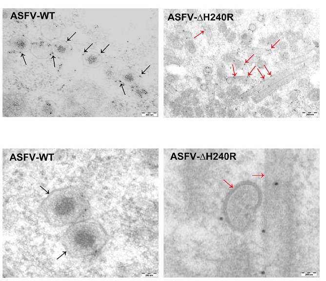 本研究中,我们探究了ASFV结构蛋白H240R(pH240R)在病毒形态发生中的作用。免疫电镜结果显示,pH240R为衣壳蛋白,并通过蛋白相互作用试验鉴定,pH240R与衣壳蛋白p72蛋白存在相互作用。利用基于ASFV HLJ/2018株(ASFV-WT)的H240R基因缺失突变体(ASFV-ΔH240R),我们发现,与ASFV-WT相比,ASFV-ΔH240R的感染性子代病毒滴度降低了约100倍,产生了大量无感染性的子代病毒。此外我们发现,pH240R稳定了正常的病毒粒子形态结构;通过透射电镜观察,在ASFV-ΔH240R感染的肺泡巨噬细胞中发现了含有管状结构和双叶状结构的病毒粒子,占所有病毒粒子的近98%。值得注意的是,这些异常形态病毒粒子可以通过出芽的方式离开细胞,这突显了pH240R在ASFV复制周期中的重要功能。我们意外地发现,与ASFV-WT相比,ASFV-ΔH240R感染原代猪肺泡巨噬细胞后,诱导了更高水平的炎性细胞因子TNF-α和IL-1β等的表达,提示H240R可能抑制了病毒感染诱导的炎症反应。该研究首次鉴定了ASFV一个新的衣壳蛋白,为揭示ASFV形态发生机制提供了全新视角。
