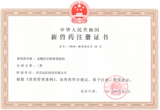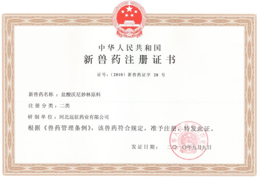 2010年9月28日,河北远征药业有限公司研发的盐酸沃尼妙林原料及预混剂被农业部批准为国家二类新兽药(农业部第1457号公告),证书号为(2010)新兽药证字28号,(2010)新兽药证字29号。