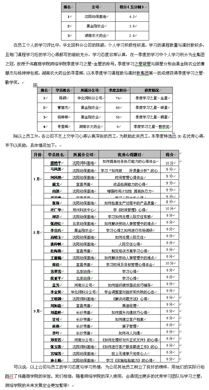 轻松学习,网院助力 伟嘉商学院网络学院一季度学习评比结果新鲜出炉 伟嘉商学院网络学院自2012年12月开始运行以来,以其学习形式灵活、课程丰富多样、学习自主性强的特点,快速成为了各分公司员工自行学习与提升的重要工具,各分公司员工快速掌握了网络学院的使用方法,并进行了多门课程的学习,为表彰第一季度学习表现优秀的团队与个人,进一步激发各公司员工学习热情,网络学院特评选出一季度最佳学习团队与季度学习之星,具体情况如下: 沈阳动保基地在第一季度所有公司中,表现优异,组织员工进行了多次学习,高质量的完成了考试及学习心得的跟进工作,并且在学习中有计划的进行了课程推进,使得沈阳动保基地的整体课程推进、学习课时数及学习心得评分在各公司中独占鳌头,成为当之无愧的季度最佳学习团队。黑金刚农业与湖南农大药业在一季度的组织学习中,也以优异的成绩分别获得亚军与季军。 |