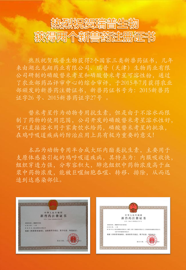 热烈祝贺瑞普生物获得两个新兽药注册证书