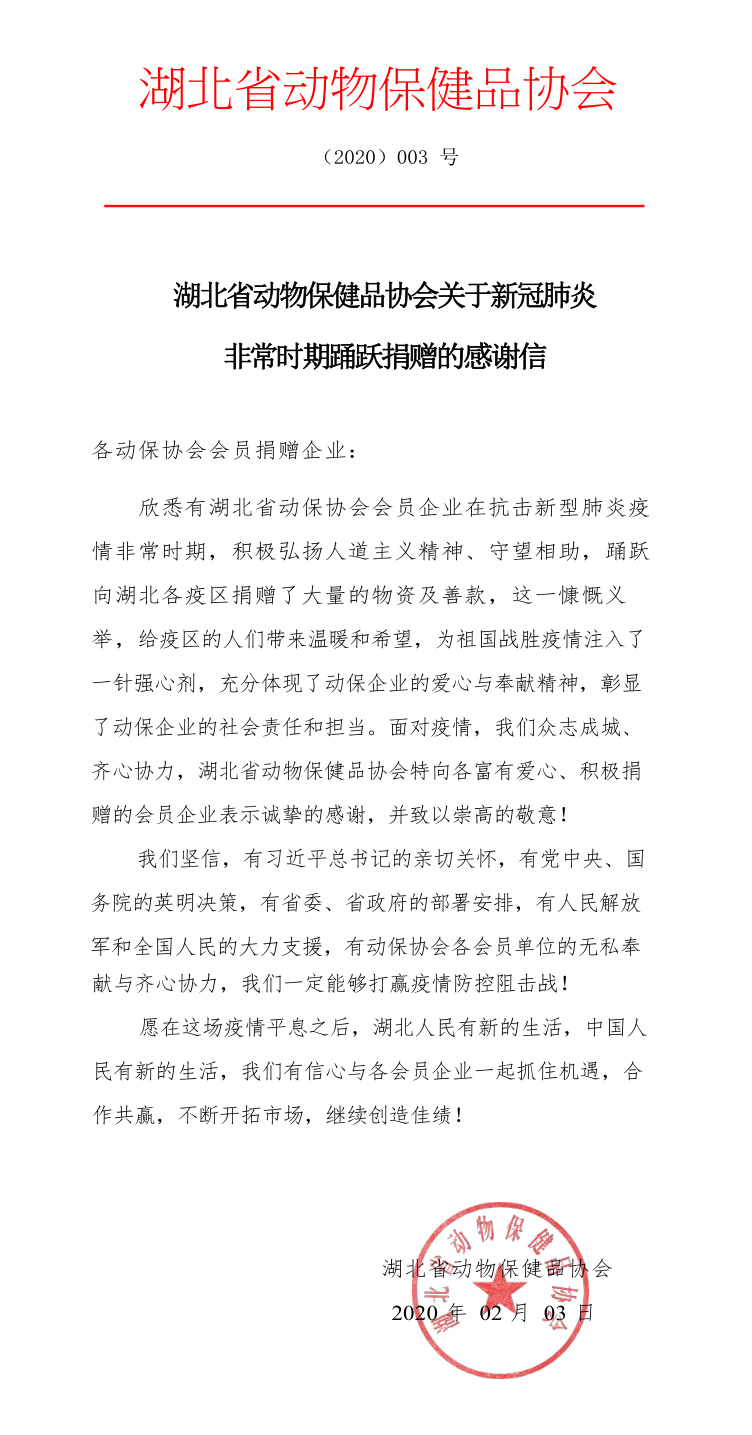 湖北省动物保健品协会关于新冠肺炎非常时期踊跃捐赠会员企业予以感谢