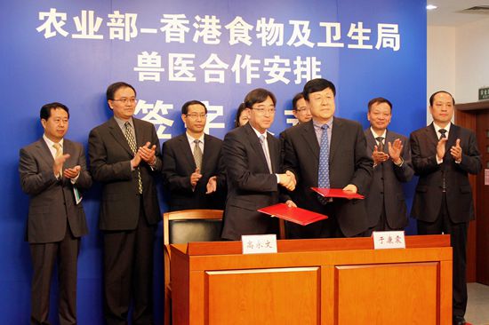 本网讯 4月23日,农业部副部长于康震、香港食物及卫生局局长高永文分别代表农业部和香港食物及卫生局在北京签署《中华人民共和国农业部与香港特别行政区政府食物及卫生局关于兽医合作的安排》(以下简称“安排”)。 于康震表示,香港与祖国内地唇齿相依,在兽医工作上各具特色。长期以来,香港以广泛的国际联系和特有的优势为内地兽医事业发展做出了重要而独特的贡献;内地也以巨大的市场和丰富的资源,全力支持香港的兽医工作。实践证明,香港与祖国内地共同应对各种挑战,共同分享发展机遇,符合两地兽医事业发展的客观需要,符合两地人民群众的根本利益。 于康震强调,此次签署“安排”既总结了以往双方合作的有效措施,也将全面开启今后双方合作的崭新篇章。双方将继续深化在兽医立法、执业兽医管理、信息交流、重大动物疫病和重点人畜共患病防控、无疫区建设和管理、国际兽医事务、人员培训等方面的交流合作,这必将进一步促进香港与祖国内地兽医事业科学发展,为国家动物卫生和公共卫生安全做出新的更大贡献。