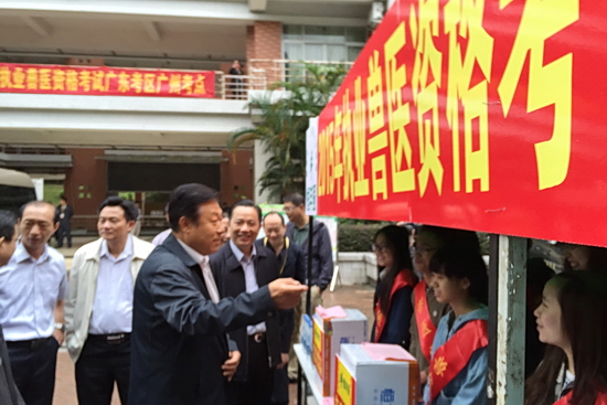 考试当天,农业部副部长于康震来到广东考区广州考点华南农业大学考场,详细了解港澳考生报名和考试情况,对考点试卷保管、考场安排、试卷分发、无线信号屏蔽等情况进行了检查,分别听取广东考区和广州考点工作汇报,并看望慰问考试一线工作人员。于康震指出,执业兽医是我国兽医社会化服务的主要力量,严格把牢执业兽医资格准入这道门槛,着力建设一支业务精良、能力完备的执业兽医队伍,对于全面提高兽医行业服务水平、持续推动兽医事业健康发展具有重要意义。各级兽医部门要努力提高工作水平,积极协调公安、教育、保密等有关部门,综合运用信息技术等多种手段,共同完成好今年的执业兽医资格考试组织实施工作,为广大考生创造安全有序、公平公正的考试环境,确保考试平稳顺利进行。