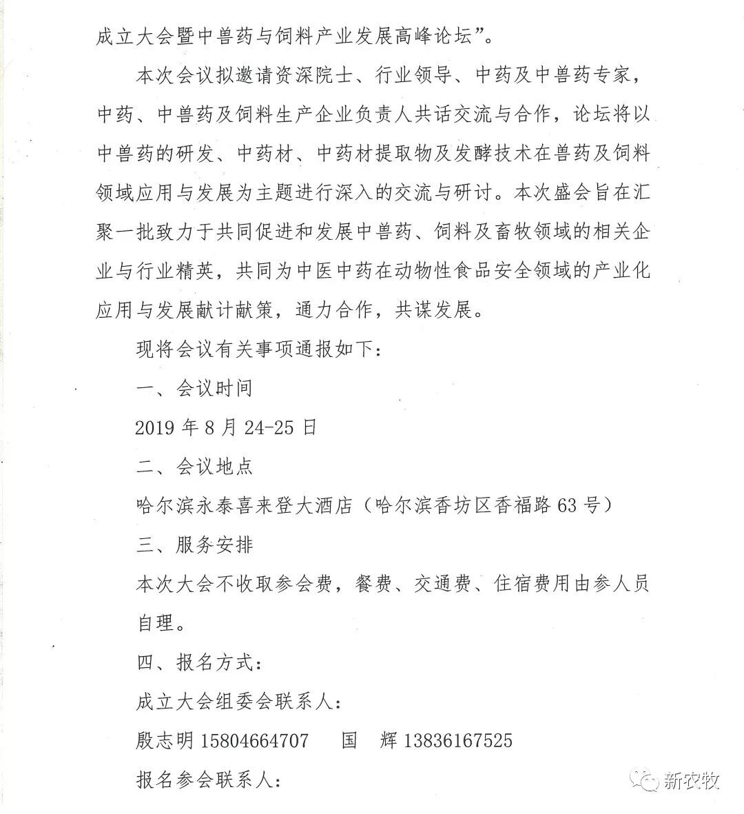 正在铺展恢宏的历史画卷,改革开放的中国再次成为全球瞩目的C位和焦点。 得风气之先者,方有机会掌控未来。没有任何个人和企业能够拒绝崭新时代的到来,农业农村部194号文件的出台,必将重塑群雄逐鹿的兽药饲料江湖版图,尽得天时、地利与人和的中国中药协会中兽药与饲料专业委员会已经找到自己的行业坐标原点——其成立大会暨中兽药与饲料产业发展高峰论坛,绝对是一场不容错过的“冰城论剑”! 大会组委会特邀印遇龙院士、蔡辉益博士、郭世宁教授、曾建国研究员、许剑琴教授、刘凤华教授、武瑞副校长等等行业大咖、权威专家针对中兽药研发、中药防控动物疫病、中兽药与饲用植物发展、中兽药质量控制与提升、微生态与发酵饲料的无抗方案、无抗时代的动物营养、无抗养殖与动物肠道健康研究、中药保健饲料的开发与应用、植物提取物替代抗生素经验最新研究等当下热点、难点、痛点的共性话题,进行学术探讨和深入互动与交流,大会盛情欢迎您的莅临参加,相信您必将受益匪浅、不虚此行。