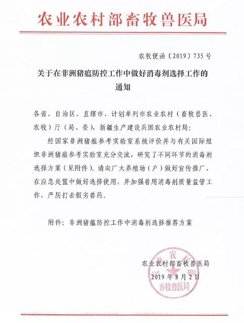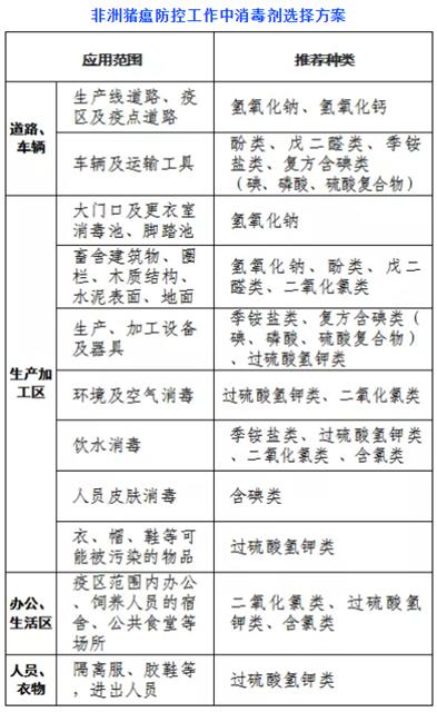 近日,经国家非洲猪瘟参考实验室系统评价并与有关国际组织非洲猪瘟参考实验室充分交流,研究了不同环节的消毒剂选择方案(见下表)。农业农村部要求各有关单位向广大养殖场(户)做好宣传推广,在应急处置中做好选择使用,并加强兽用消毒剂质量监管工作,严厉打击假劣兽药。