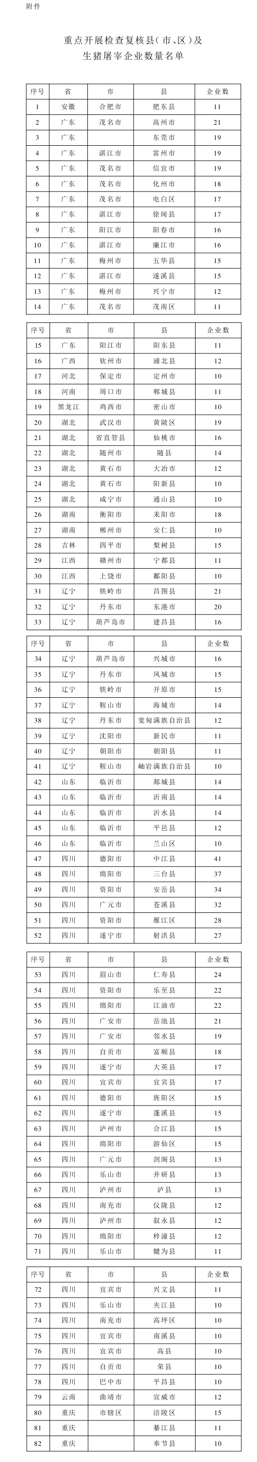 今年4月以来,各地按照我部统一部署,开展了落实生猪屠宰环节非洲猪瘟自检和官方兽医派驻制度百日行动,生猪屠宰企业非洲猪瘟防控能力逐步提升,官方兽医派驻制度全面落实,生猪屠宰管理秩序进一步规范。但一些地方仍存在小型生猪屠宰场点过多、设施设备陈旧、生产工艺落后、肉品品质检验落实不到位、停产企业违规生产、私屠滥宰时有发生等问题。为有效防控非洲猪瘟,维护生猪产品质量安全,现就加强生猪屠宰监管有关事宜通知如下。 一、强化生猪屠宰企业监管 (一)从严审批定点企业。小型生猪屠宰场点,以县为单位计算,只减不增。其余生猪屠宰企业设立,必须符合发展改革委《产业结构调整指导目录(2011年本)》(2013年修订)中规定的“设计年屠宰生猪能力不低于15万头”和省级人民政府设置规划要求。设区的市级人民政府要组织严格审查;省级畜牧兽医主管部门要严格把关,并及时将新建生猪屠宰企业名单报我部公布。 (二)开展重点地区企业资格复核。各地要按照农业农村部公告第212号公布的名单,重点组织对生猪屠宰企业数量超过10个的县(市、区)开展自查,坚决关停环保设施设备不符合要求、屠宰设施设备陈旧、屠宰工艺落后等问题企业。在各地自查基础上,我部将于11月中旬组织专家逐县开展复核,主要复核生猪屠宰企业资质情况、环保设施设备情况、屠宰设施设备与屠宰工艺匹配情况、动物防疫条件情况以及肉品品质检验实施情况等,对问题严重的企业,一律予以关停,并向全国通报。 (三)加强质量安全监管。各地要督促生猪屠宰企业落实质量安全主体责任,完善肉品品质检验制度,按要求配备肉品品质检验员,按规程实施肉品品质检验。提供代宰服务的企业要切实落实生猪入场查验、肉品品质检验、出厂检查、无害化处理以及车辆进出场消毒等要求。对于不按规定实施肉品品质检验、代宰户直接宰杀生猪、出租出借场地等行为的,一经发现,一律予以关停。要严格按照我部公告要求,尽快实现生猪屠宰企业名单与动物检疫证明电子出证系统关联,从明年1月1日起,凡不在名单内的生猪屠宰企业,动物卫生监督机构不得派驻官方兽医,严禁出具动物检疫证明。 二、严格屠宰环节非洲猪瘟自检 (一)规范非洲猪瘟自检要求。各地要督促生猪屠宰企业建立健全非洲猪瘟自检制度,按照“批批检、全覆盖”原则开展非洲猪瘟检测。要确保使用我部批准的或经中国动物疫病预防控制中心评价后公布的诊断试剂。要规范检测操作程序和检测报告格式内容,明确样品和检测记录、检测报告保存期限等。 (二)提升屠宰企业检测能力。各省级动物疫病预防控制中心要加强对生猪屠宰企业非洲猪瘟检测实验室建设的指导,细化采样规范和检测技术要求,在11月底前对所有生猪屠宰企业以及承担生猪屠宰企业委托检测的单位开展一次比对实验,不合格的,要立即停业整顿。市级以上动物疫病预防控制中心要组织对2019年5月1日以来生猪屠宰企业留存样品按照不少于3%的比例进行抽检,发现检测结果不准确的,按照10%比例再行抽检,对于检测结果出现严重失真的生猪屠宰企业,一律予以关停。 (三)严格检出阳性的后续处置。生猪屠宰企业检出非洲猪瘟病毒核酸阳性样品的,要按规定程序上报并规范处置,严禁相关生猪及其产品流入市场。对流通、加工环节检出的非洲猪瘟病毒核酸阳性样品溯源到的屠宰企业,一律停产15天,经严格消毒、检测评估后恢复生产,对扑杀的生猪、销毁的生猪产品不予补偿。对溯源到的屠宰企业,中国动物疫病预防控制中心将组织开展飞行检查,检查情况向全国通报。 三、严厉打击生猪屠宰违法犯罪行为 当前,各地要按照中共中央纪委机关、国家监察委员会的总体部署,切实做好《“不忘初心、牢记使命”主题教育活动中开展整治食品安全问题联合行动》中的生猪屠宰专项整治活动。要压实地方政府责任,对于不担当、不作为,在清理关停不符合要求屠宰企业的工作中打折扣、搞变通、降标准,造成食品安全隐患的,要配合纪监部门严肃问责。要高度重视当前猪价高企情况下,受高额利益驱使,屠宰环节违法犯罪行为易发高发的隐患,保持对私屠滥宰、注水注药、屠宰病死猪等违法行为的高压严打态势。要加强日常监管,加大对重点地区、重点环节、重点时间段的巡查、暗访力度。要健全部门联动机制,及时向公安机关移交涉嫌犯罪案件线索,并在技术支持等方面全力配合好公安机关办案。要配合市场监管部门做好市场经营环节“两章两证”查验后的确认工作,并做好证章标志追溯工作,发现违法违规行为的,一律从严处理。 四、进一步规范动物检疫秩序 各地动物卫生监督机构要严格按规程开展动物检疫工作,对符合条件、依法合规调运的生猪和生猪产品,不得以保障本地市场名义拒绝出具跨省调运动物检疫证明;不得通过暂停动物检疫出证等方式限制生猪和生猪产品流通;不得违规收费或倒卖动物检疫证明,扰乱正常市场流通秩序。各地要加大监督检查力度,一经发现上述行为,依法依规严肃追究有关人员责任,并进行通报。 附件:重点开展检查复核县(市、区)及生猪屠宰企业数量名单