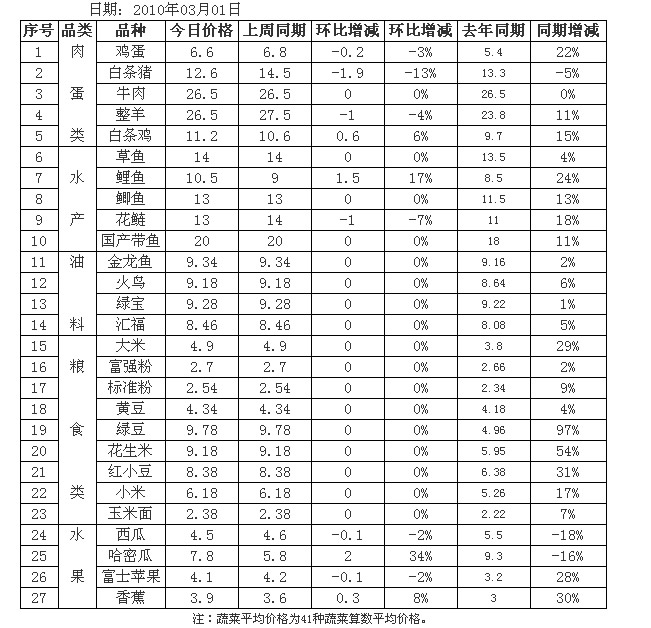 1、鸡蛋批发价格6.60元/公斤,周环比下降3%;同比上涨22%(详情参见附表)。 2、4种主要肉类商品中,白条猪价格12.60元/公斤,环比下降13%;同比下降5%。 整羊价格26.50元/公斤,周环比下降1.00元/公斤,降幅4%; 白条鸡价格11.20元/公斤,周环比下降0.60元/公斤,环比上涨6%; 牛肉价格稳定。