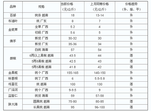 一、部分品种价格情况 ![]() 二、热点点评 百部:本期升幅比较明显,越南货由上月的13-14元涨至18元,涨幅在30%左右,是本期最明显的品种,市场货源不多,多商求购,持货商要价坚挺。后市点评:百部为野生品种,资源的大幅减少是价格上涨的最直接因素,目前无论是国内还是国外产区均反映货源少,药农采挖也不积极。当前百部的市场库存量空,由于涨幅过快预计市场会有一段盘整期,长远来看仍会有利好。 金钱草:产新期间因为落至近年低价,商家入手囤货,产新结束后市场行情开始逐步上涨,目前广西桂林全草市价升至5.2元左右,切段货5.6元,广东全草4-4.5元,切段货5-5.5元,市场商家大货惜售心理偏强。 后市点评:金钱草目前货源量产地相比往年同期偏少,主要是集中在市场商家手中。其今年产量下降,收购价低,产地农户留种不积极,明年的种植面积因此将会进一步缩减,预计其后市将会持续向好。 金果榄:因前段时间产区阴雨天气较多给加工晾晒带来不便,造成本期市场上市货源偏少,价格由140-150元升至155-165元,时有商家批量求购,但货源不易组织。 后市点评:金果榄为野生品种,表面看是天气造成上市货少价格上涨,但其实质是货源经连年的无序采挖造成的供应量锐减所致,该品目前销量虽不大,但需求方面却呈稳中有增的趋势,因此仍会有上涨的后劲。 粉葛:随着产新临近,近来市场行情价格略有回升,现加工方式已经由传统的全手工切制转向半手工半机器切制,统丁由原来的5.5-5.8元升至6元左右,产地、市场可以销售的货量还是较为充足。 后市点评:粉葛根今年的种植量还是偏多,产量会较高,目前产区已经开始少量采挖,但多是作蔬菜销售,该品药食两用,保健品方面需求量也较大,后期行情变化与其自身在药材、保健品、蔬菜领域的分配量有一定的联系,总体分析,明年粉葛的药市行情可能不会有很好的表现。 胖大海:本期市场销势迟缓,货源走动不快,行情也在盘整了较长一段时间后有所松动,各规格价格下滑了5元左右,现统货圆果75-80元,长果95元,优质货圆果85元,长果105-110元。 后市点评:胖大海当前有货的商家不多,货源主要是集中在大户手上,由于近期市场处于销售淡季,商家也难有大作为,但因其距离产新还有较长的一段时间,持货商接下来也不会轻易开大仓,因此预计后市持续下滑难度偏大。 三、综合分析 http://www.zyctd.com/info-item-528429-1-1.html (责任编辑:admin)  |
