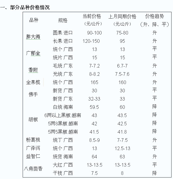 ![]() 二、热点点评 胖大海:本月产新市场商家关注度增加,受以前高价的吸引,行情大幅攀升,现圆果由产新前的75元涨至100元,长果由100元涨至140-150元,市场有批量货源走动,持货商较为惜售。 后市点评:胖大海每年的产新都会成为商家关注的热点,一是往年高价的吸引,二是其产区生长等各方面的特殊性,今年一产新便有商家到国外产区收购,收购价由开始时的60元左右,十天时间左右升至目前的70元。市面上,库存尚有,但持货商出售不积极,造成可流通量显少的迹象。胖大海的涨价,人气占据了很大的因素,从目前至长果产新前后预计人气都会不低,因此接下来后市应还会有良好的表现。 香附:大货走动不如前期,但上市货源也有减少,行情继续向好,现市场9成左右干光统货8-8.2元,选货9-9.5元,毛统7-7.2元,相比上期上涨0.3-0.5元。 后市点评:香附子由于前期价低,商家、单位购货量增加造成行情反弹,本期市价的上涨,仍是前面价低反弹的延续。但香附子的社会货源存量仍然较丰,家种、野生资源并存,供大于求的局面短期内难以得到有效的缓解。对于后市,唯一的看点就是市价不高,行情难以再回调。 金果榄:近期市场来货量依然不大,价格持续呈现稳步上升的状态,现广西产统个涨至160-170元,选个180-190元,市场时有批量货源走动。 后市点评:金果榄属于野生资源,多年来行情只涨不落。近年受高价的刺激产区采挖力度加大,产量一年年递减,需求得不到满足。目前因销量有限商家关注力度暂不大,但后市涨势势不可挡。 粉葛:上期市场行情上浮,本月涨势持续,统丁由上期的7-7.5元升至8.5元,中心丁升至10元以上,市场来货量仍然不大,即使偶有来货也很快外销。 后市点评:粉葛去年最低5.5元的价位,已经跌破市场经销商的成本价,今年新货收购时行情偏低,加上天气影响上市量有限,商家惜售手中货源,造成春节后行情上扬。目前价格相比春节前涨幅已经超过50%,商家出货积极性增加,但由于产区加工力度有限,新货应市量不大。当前价位商家已有一定的利润空间,但后市仍然值得期待。 三、综合分析 本期除个别品种行情上涨明显外,其他品种多是稳定为主,即使有回落也是幅度甚微。总体来说家种品种近年发展起来的产量仍在消化,野生品种资源短缺仍是当前需解决的问题。一段时间内药市总体状态仍会波澜不惊,商家宜在平稳的经营过程当中捕捉商机,获取利润。 http://www.zyctd.com/info-item-540691-1-1.html (责任编辑:admin)  |