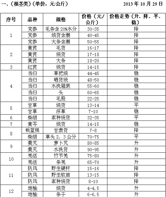 十月甘肃陇西文峰中药材市场销售品种价格及走势表