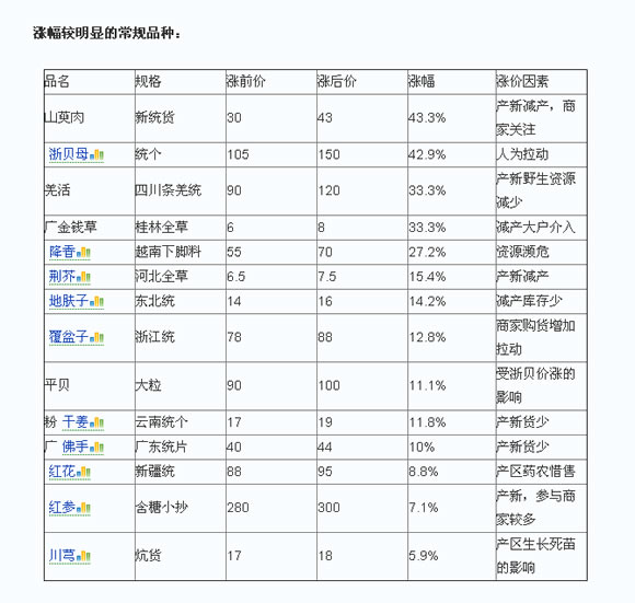 10月份,涨价的品种势头要强于9月,其中山萸肉、浙贝涨幅超过40%,羌活、广金钱草也在30%以上,涨价的因素仍是生产调减占据了主势,人气是助推。目前市场已经进入销售旺季,虽然行情交易没有想象中的那么好,但后期涨价的品种仍会陆续呈现。![]() 行情上涨明显的品种摘评: 山萸肉:因为历史高价的吸引,每年产新期都不乏关注,今年三、四月份开花授粉期产区遭受了雾霾、倒春寒以及后来的干旱影响,商家关注度增加并有资金介入,产地货源消化良好,价格微升后转稳。10月份各产区陆续产新,反映的消息均是产量有所下降,收购价比去年同期要高,随着市场关注力度的加强,行情稳步上涨,现优质好货市价已经在50元之上,新货统货45元左右,相比产新前涨幅已经超过40%。从近几年的市场状况来看,山萸肉仍有较大的陈货库存,目前由于持货商多已实现较大的利润,出售意愿较强,预计后期库存将会进一步被拉低,市价将会转为震荡。 羌活:四川产区产新已经结束,由于今年产量下降,产地收购力度加大,近一个月行情上涨明显,目前条羌市价在120元左右,蚕羌个别市场已经达到180元之高。羌活行情在10月份突然发力,主要是因为其和大多数野生品种一样,资源越挖越少,进入越少越挖,越挖越涨的恶性循环,而这种情况的出现再加上商家关注度的增加,更加速了其价格的上涨。现产新刚过,部分产区便反映货源已经基本走空,预计今年产量减半加上库存薄弱的影响,对其后市的上涨仍具有较强的推动力。 广金钱草:经历了两年多的低迷,市场人气已逐渐低落,产区连续减种,库存得到有效消化,供求缺口在今年再次出现,目前产区产新已经接近尾声,今年两广产量不足2000吨,除了广西桂林尚有大规模种植外,南宁、百色产区基本已经绝种,玉林以及广东湛江尚有零星保留。目前广金钱草货源主要集中在大户手中,行情容易掌控,再加上大户已经形成了自己的固定销售网络,不愁销路;另外当前产新已成定局,至下季又要过一年,预计在此期间内广金钱草的行情极有可能突破历史高位。 浙贝:上个月(9月)的价位已经得到明显拉升,10月市场仍意犹未尽,中旬开始行情再度发力,后期最高价达到150元,短时间内拉升如此之大,令人瞩目。目前市场常年经营户手中的货源量都不大,主要集中在少数人手中,因价高,市场商家多是随购随销,担心行情涨得过快跌得也过快。总之,浙贝行情的飙升人为因素占据了主导,这往往会令一些投资者头脑发热,过分投入,但撑死胆大的饿死胆小的,这放在今年的浙贝上是否完全正确还有待时间的验证。 9月涨价的品种本月变化跟踪: 柏子仁:因价高的影响,市场货源走动量有所减少,行情逐渐恢复平静,价转为稳定;浙贝母:受人气推动,行情持续上涨,但近期商家多转为观望,市价有回落走向;广郁金:新货批量上市,市场货源逐渐积聚,行情下滑明显;壳砂:本期市场货源走动转缓,商家停手观望,加上产地来货的冲击,行情明显下滑,进口货降价幅度在10-15元之间。 相关消息: 九月中药材行情明显上涨品种点评 八月中药材行情涨落明显品种回顾与点评 七月份中药材行情明显下跌品种回顾与点评 http://www.zyctd.com/info-item-606622-1-1.html (责任编辑:admin) |