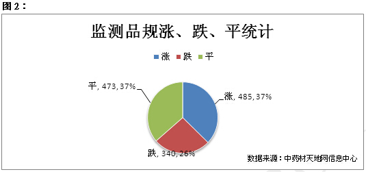 与去年同期价格相比,本月升价品规485个,本期升价品规占总量37%;降价品规340个,占本期品规总量26%;平价品规473个,占本期品规总量约37%。(见图2)
